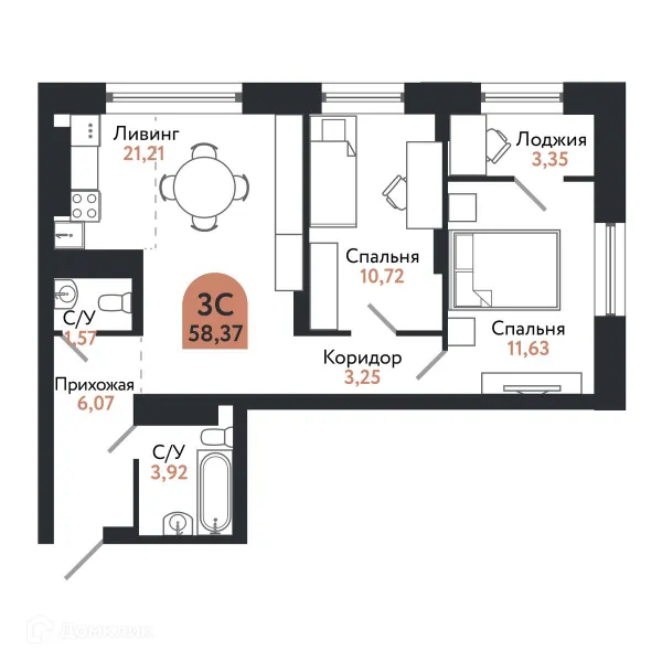 3 комн. квартира в Томске в ипотеку от 65 457 руб/месяц