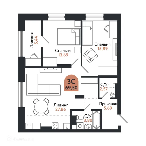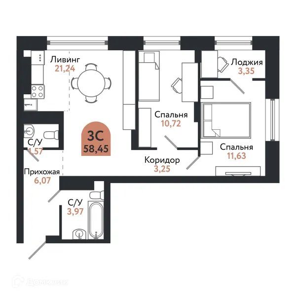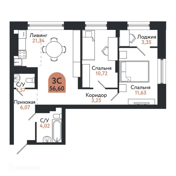 3 комн. квартира в Томске в ипотеку от 73 795 руб/месяц